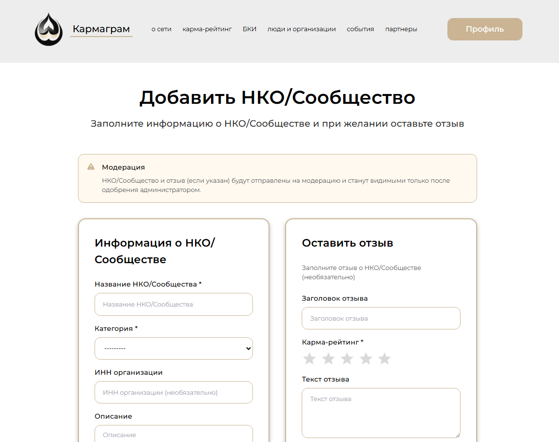 Дорогие друзья, мы рады объявить вам о важном обновлении нашего сервиса отзывов на платформе Кармаграм. Теперь вы можете оставлять обратную связь не только о компаниях и частных лицах, но и о некоммерческих организациях, включая религиозные объединения, благотворительные фонды, общественные клубы и многое другое!
